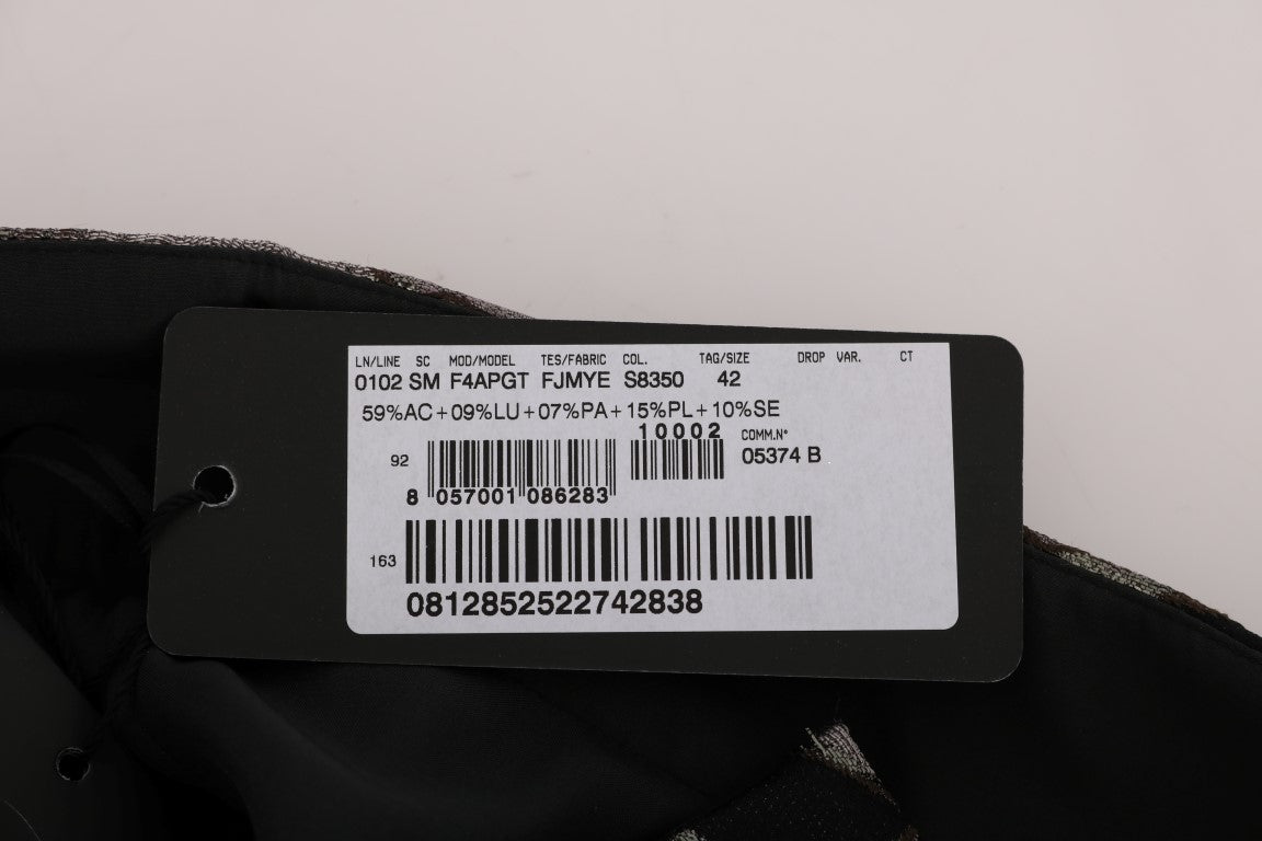 Step into luxury with this Dolce & Gabbana black silver brocade floral skirt! This gorgeous, above-the-knee skirt, brand new with tags, features a stunning black base with silver floral accents. Crafted in Italy from a luxurious blend of acetate, polyester, silk, metal fiber, and nylon, this designer skirt boasts a flattering straight cut and convenient zipper closure. The iconic Dolce & Gabbana logo adds a touch of signature elegance. Elevate your style with this exquisite piece—100% authentic and ready to make a statement!