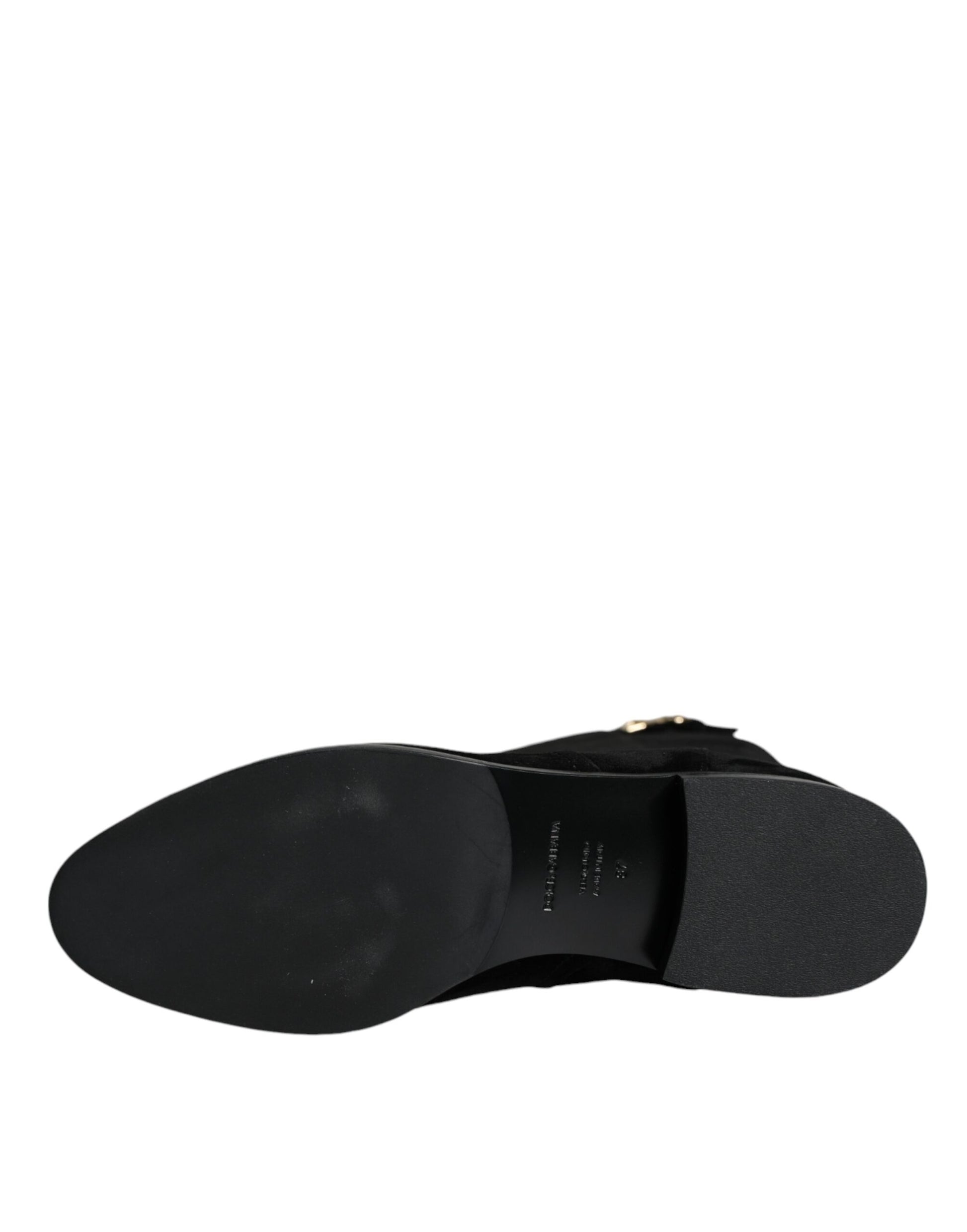 Step into timeless elegance with these stunning Dolce & Gabbana black suede knee-high boots. Crafted from luxurious 100% lamb leather in Italy, these flat boots combine high-end fashion with unparalleled comfort. The sleek design, adorned with subtle logo details, effortlessly elevates any outfit from day to night. With their versatile style and premium leather sole, these authentic D&G boots are the perfect investment piece for the fashion-forward woman who demands both quality and style. Experience the exquisite craftsmanship and comfort that only Dolce & Gabbana can deliver, and make a statement wherever you go with these must-have black suede knee-high boots.