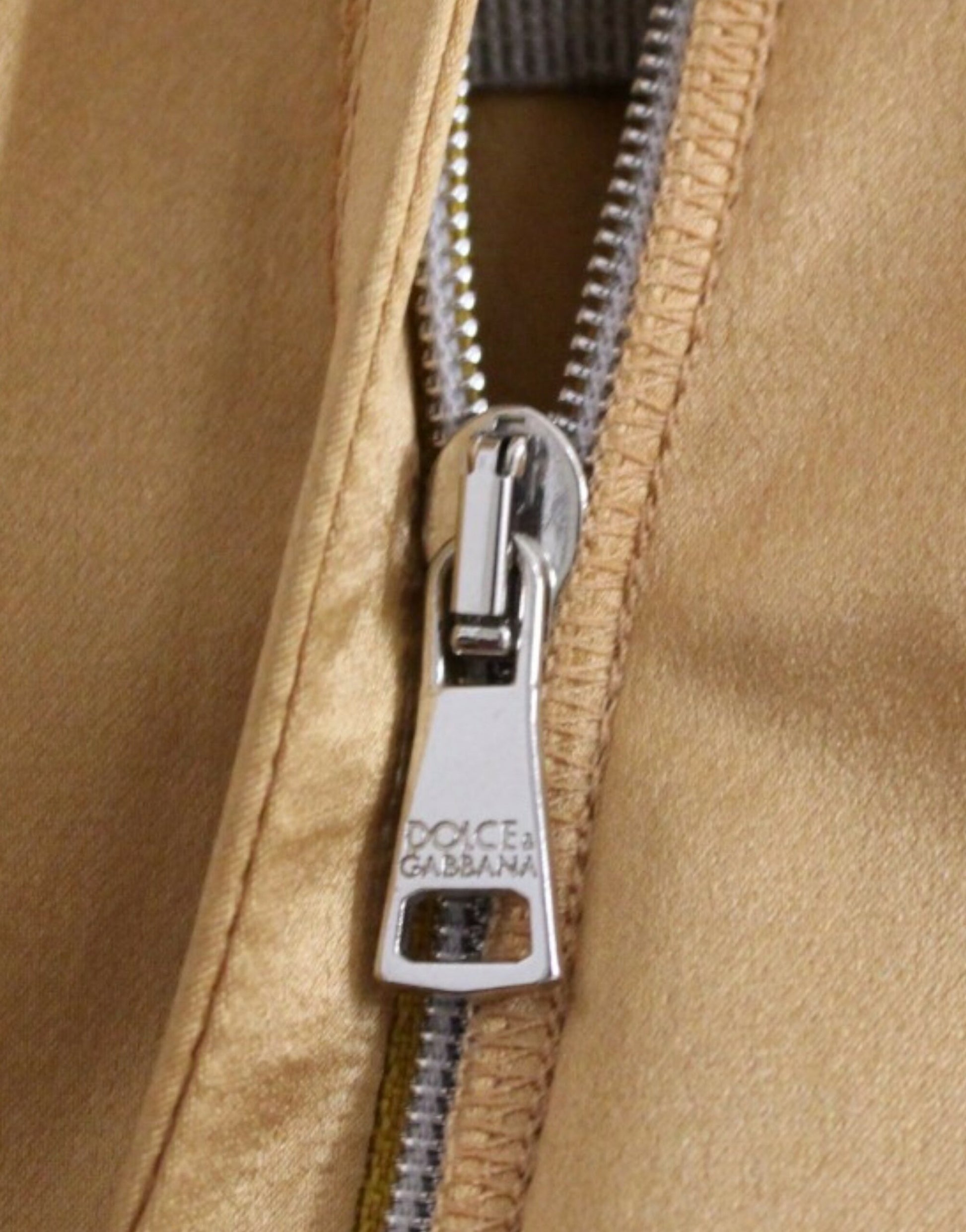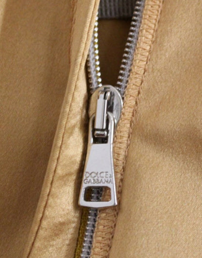 You'll exude elegant sophistication in this luxurious bronze silk sheath dress by Dolce & Gabbana. Crafted from 100% Italian silk for an ultra-rich feel, this knee-length stunner features an alluring sheath silhouette that flatters your curves in all the right places. The back zipper makes it easy to slip into this beauty and achieve the perfect fit. Whether you're attending a formal event or upscale dinner, this Dolce & Gabbana original, finished with their signature logo details, will have all eyes on you.