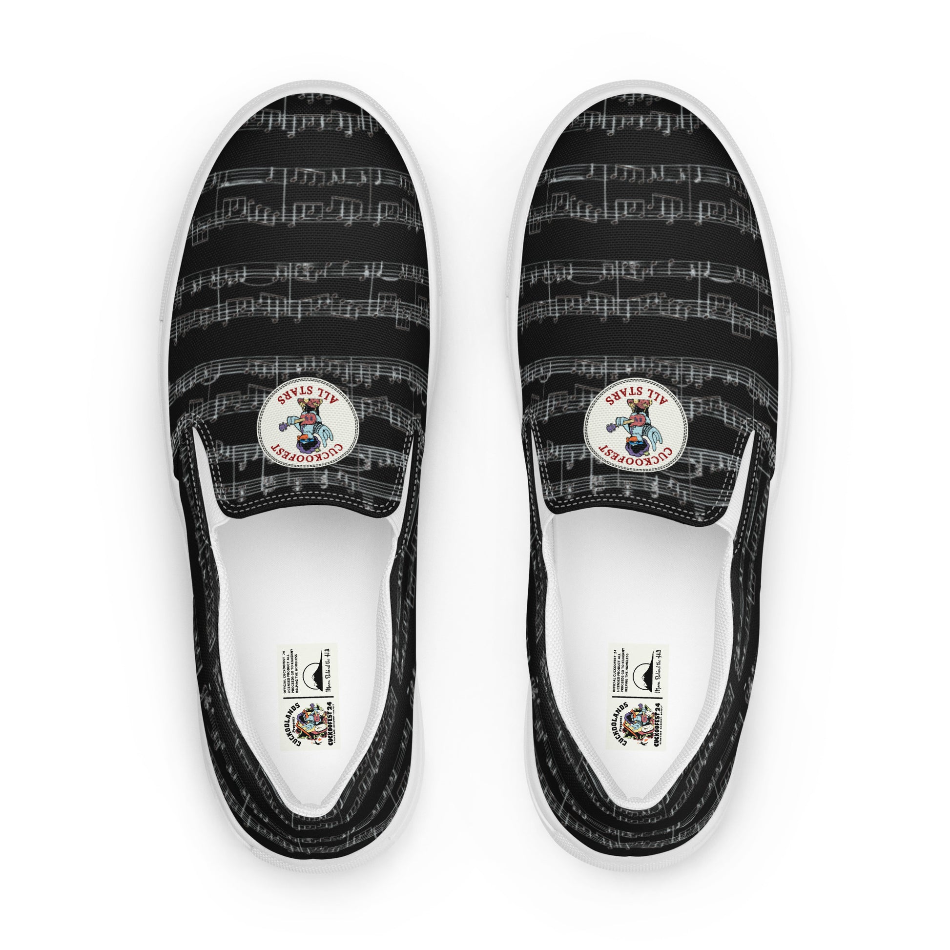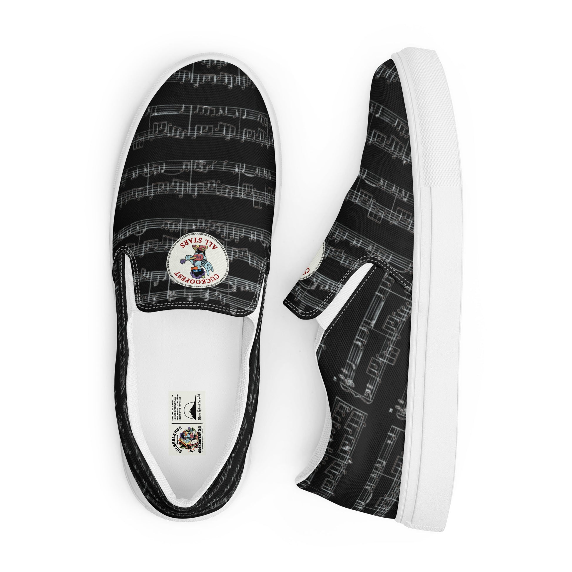 Dive into the heart of music with our Cuckoofest '24 Women’s Slip-On Canvas Shoes, your perfect festival companion! Embrace each step with the iconic "Free Bird" solo by Lynyrd Skynyrd, intricately woven throughout the design, topped with our exclusive Cuckoofest All Stars design. Crafted for comfort and style, these shoes feature a 100% polyester canvas upper, paired with a supportive EVA rubber outsole. Enjoy the luxury of a soft insole, breathable lining, and easy slip-on with elastic side accents. Handmade with a padded collar and tongue, they're designed to keep your feet in bliss, song after song.
