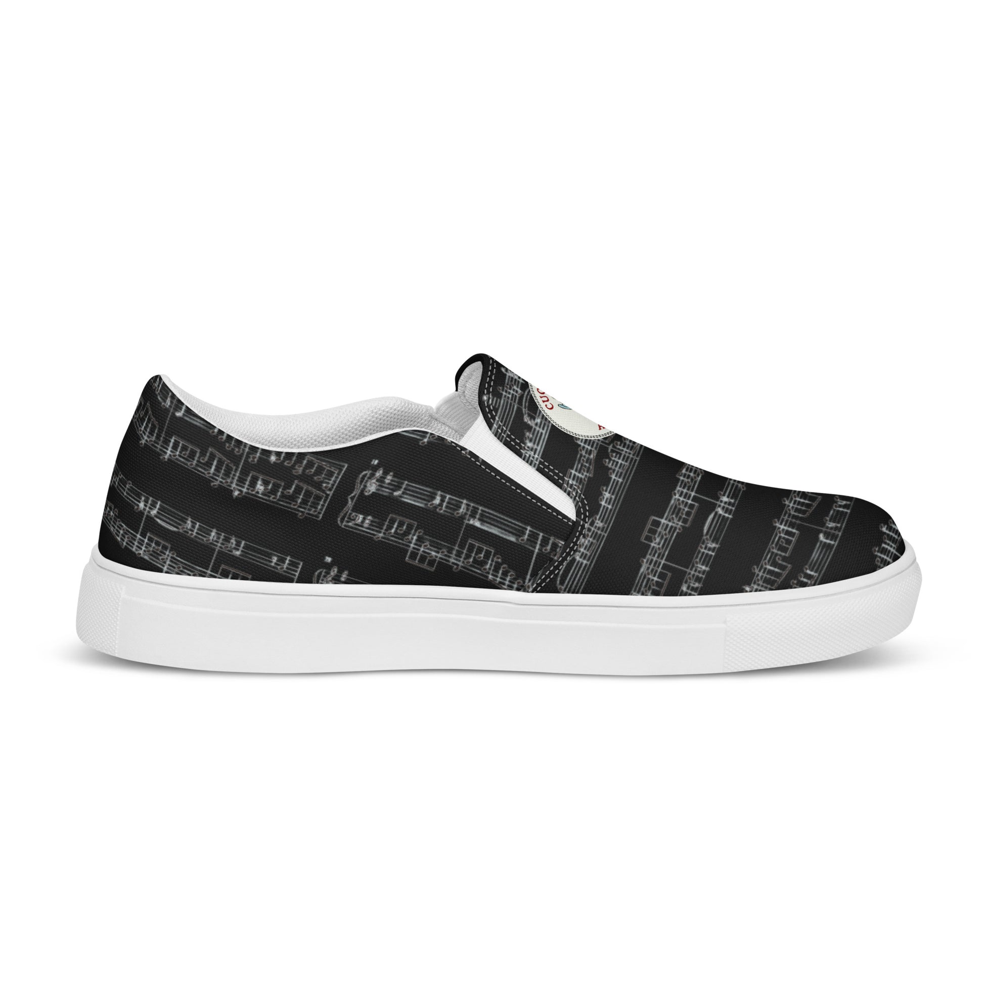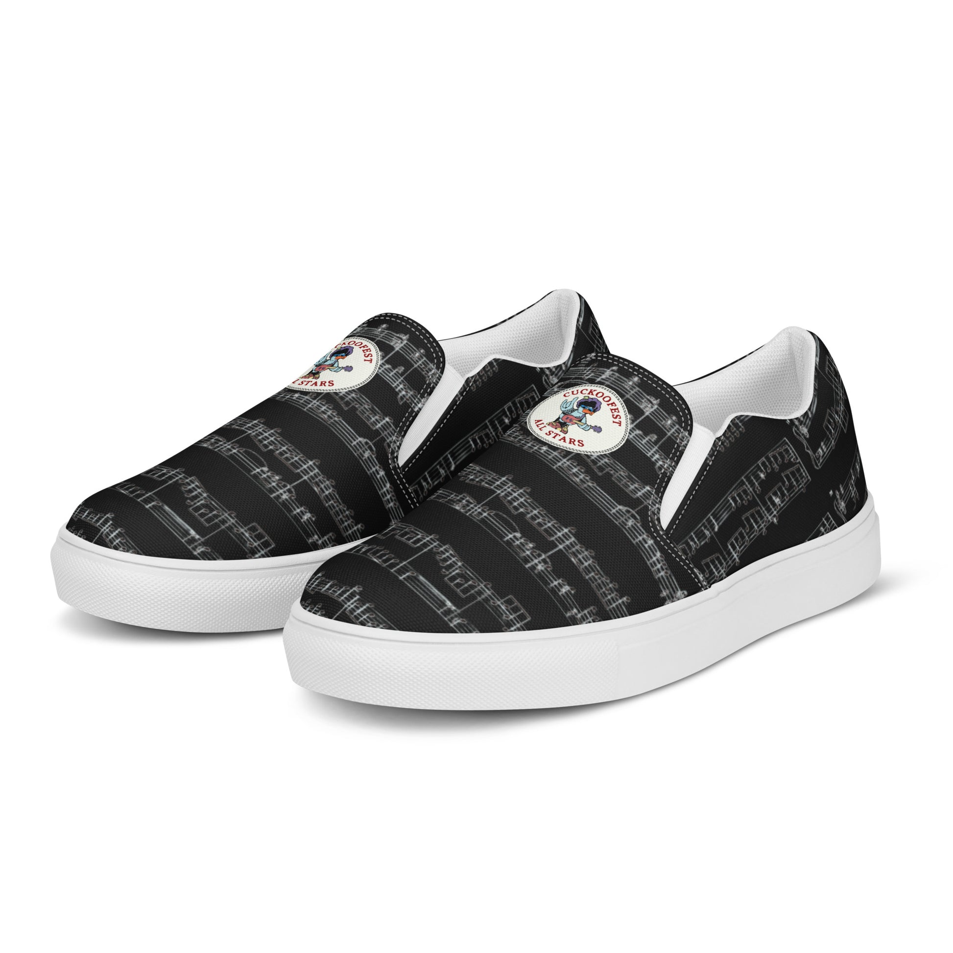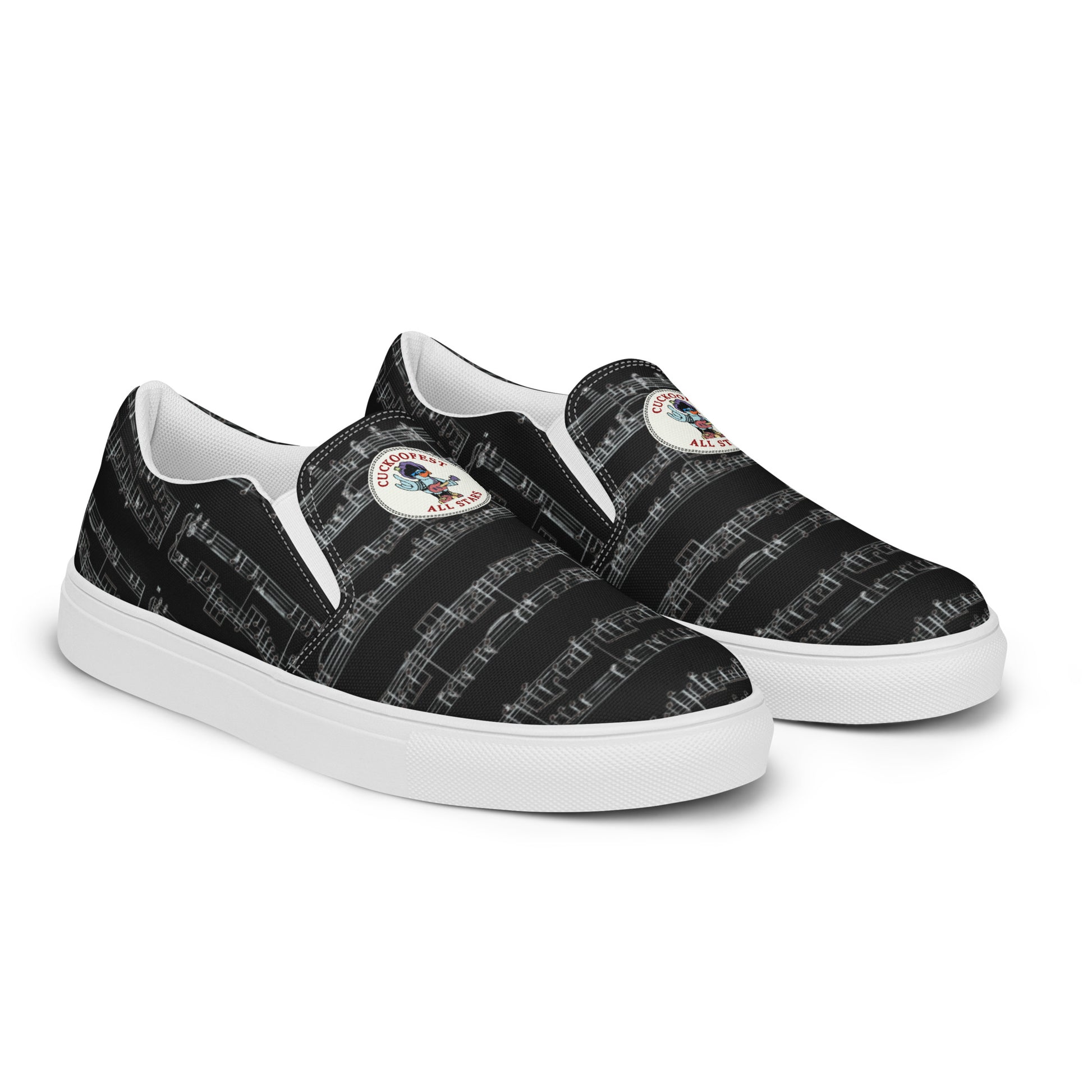Step into festival-ready style with our Cuckoofest '24 Women's Slip-On Canvas Shoes! These eye-catching sneakers feature the iconic "Free Bird" solo by Lynyrd Skynyrd woven into the design, making them the perfect companion for music lovers. Crafted for all-day comfort, these shoes boast a breathable polyester canvas upper, supportive EVA rubber outsole, and a soft, removable insole. The padded collar and tongue, combined with elastic side accents, ensure a snug yet flexible fit that'll keep you dancing from dawn till dusk. Handmade with care, these versatile slip-ons effortlessly blend fashion and function, completing any festival outfit with ease. Don't miss out on these limited-edition, comfortable canvas shoes that'll have you rocking in style all season long!