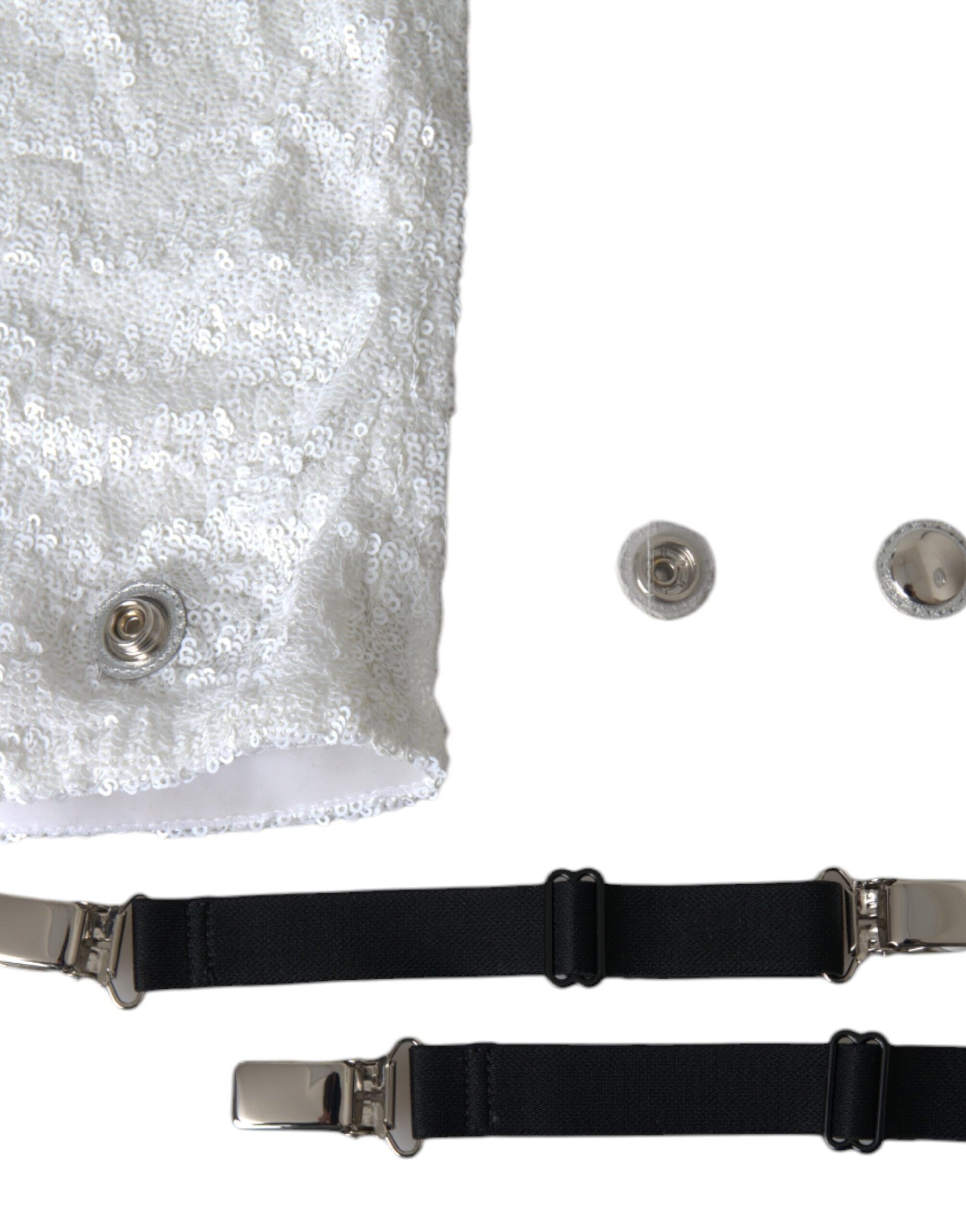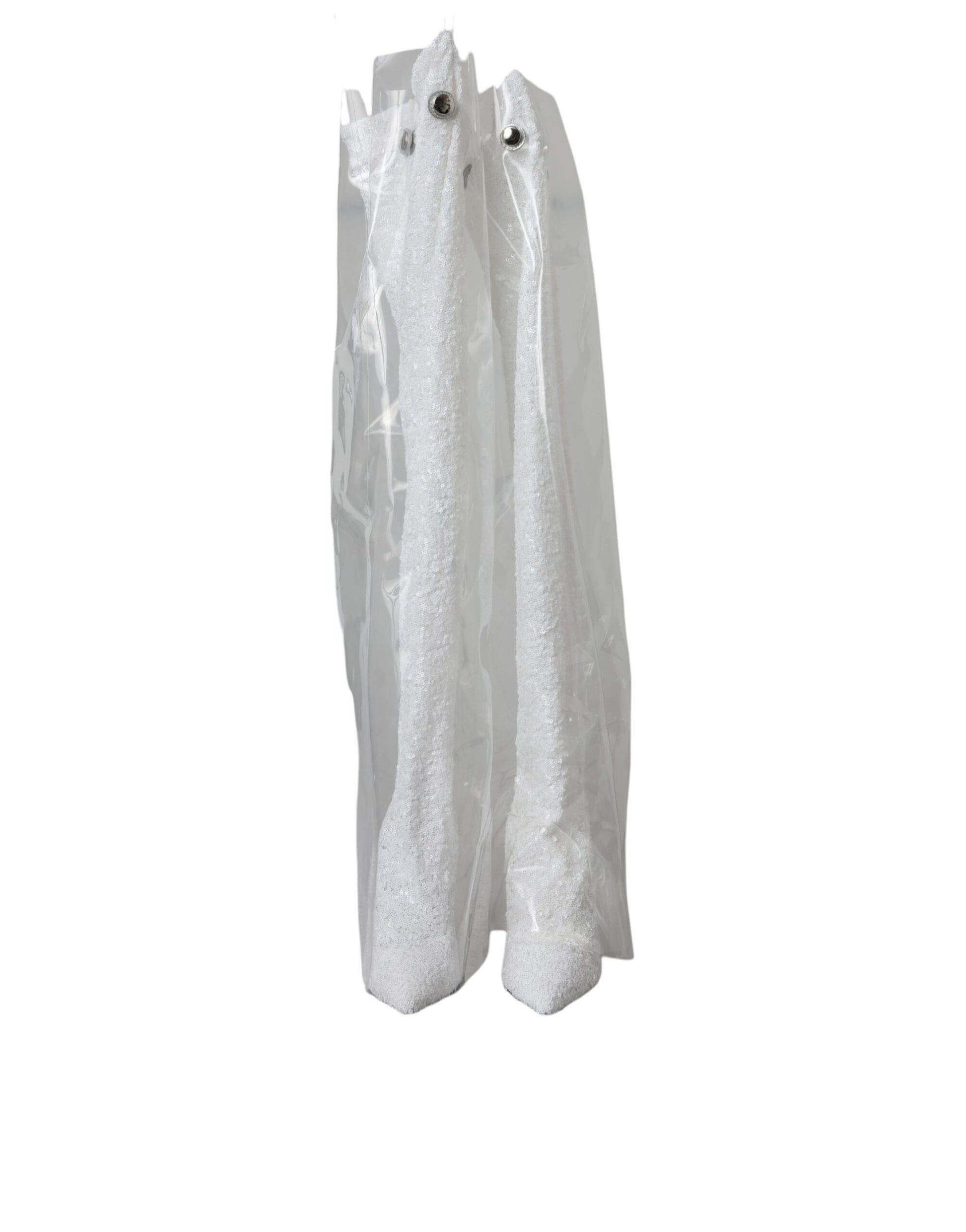 Step into elegance with these stunning white knee-high stiletto boots from Dolce & Gabbana. These brand-new, authentic boots, crafted in Italy with high-quality materials, feature a sleek design perfect for making a statement. The shimmering sequins add a touch of glamour, while the leather sole ensures comfort and durability. Elevate your wardrobe with this exclusive, high-fashion footwear piece, designed to turn heads wherever you go.